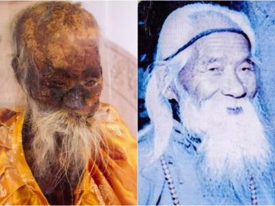 102岁高僧吴云青98年圆寂后,其肉身至今仍未腐烂,图右为其生前照。 吴云青肉...