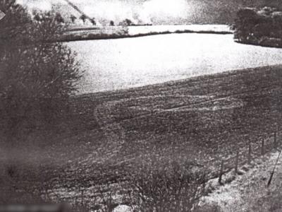 这个看起来似英文字母“G”字的麦田圈,尾部指向一个兵工厂。 (蜘蛛网报道)麦...