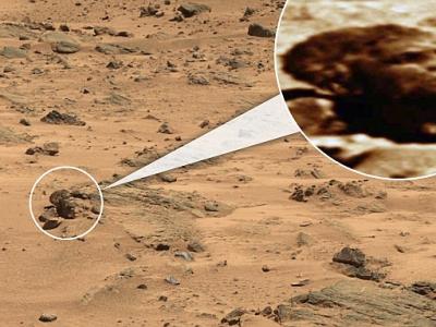 UFO爱好者称,火星上的这块岩石很像奥巴马的头部。 这是火星表面的原始照片。...