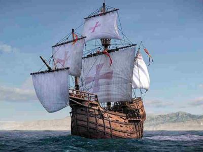 联合国专家认为,该沉船残骸并不属于哥伦布船队,图为哥伦布船队的模拟图。 (蜘...