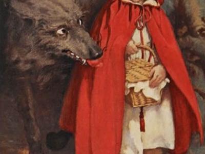 故事《小红帽》中的插图,一只大灰狼和穿着红衣服的小红帽一起走路 故事《小红...