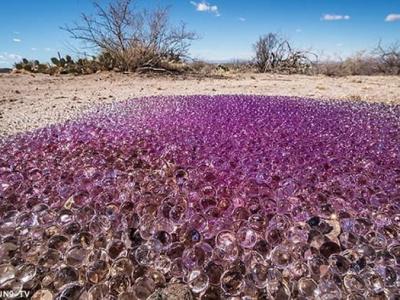 美国图森沙漠中心区域出现数千个紫色小球 可能性:一些人猜测这些出现在沙漠中...