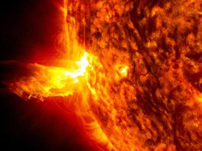 太阳风暴有时会包含太阳闪焰,在这张影像中,高能粒子从太阳喷射出来。 IMAGE BY N...