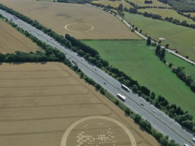 巴克夏郡M4高速路两侧麦田出现的怪圈,两个怪圈图案都和都灵裹尸布上的耶稣脸部形...