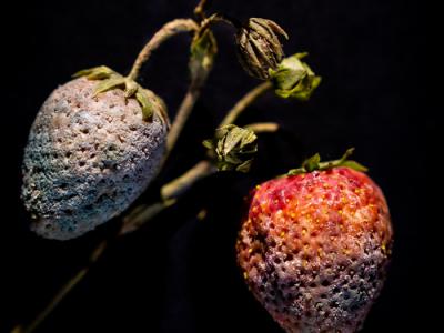 这个玻璃雕塑记录下了草莓长满葡萄孢菌(Botrytis)的模样。 这项展品在哈佛大学的腐...