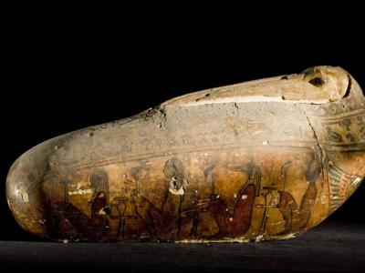 一枚圣鹮木乃伊的特殊外层──由亚麻和泥灰制成的外壳──重现了这种鸟的长喙与头部...