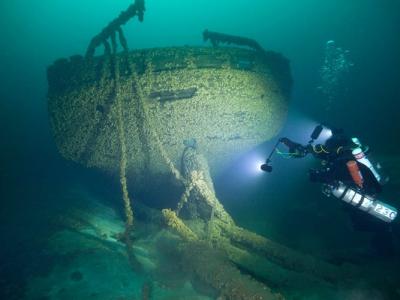 潜水专家在密歇根湖底发现该两艘内战时期沉船。沉船的船桅互相压住。其中一艘沉船有...