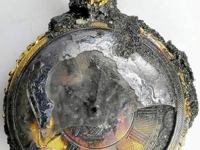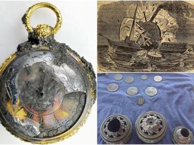 金表(左)记录了意外发生的时间,专家还寻获了其他宝物。专家...