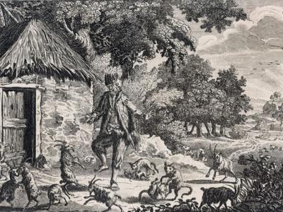 海盗赛尔科克(Alexander Selkirk)和羊群在荒岛上同欢(画中的陋舍有误)。赛尔...