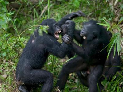 刚果共和国的一处动物收容所中,两只倭黑猩猩正在大打出手。 PHOTOGRAPH BY CYRI...
