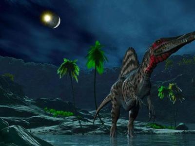 地球白垩纪的夜晚,小行星撞击月球想象图,图片地点为埃及,恐龙为棘龙 1994年...