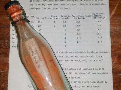 一名女子在德国安鲁母岛的岸边发现了一个瓶中信——类似照片中的这一个——大约1...