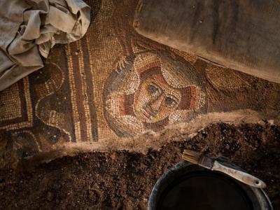 最近的发掘工作揭露了一幅马赛克镶嵌画一隅的剧场面具图像。 PHOTOGRAPH BY MARK...