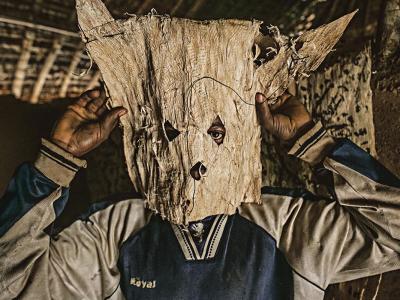 刚果民主共和国一座小村落的猎人调整他追踪猎物时所要戴的面具。食用受感染的野生...