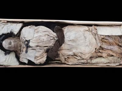 温斯特普的双脚底下有一具婴儿尸体 婴尸是研究员为棺木进行电脑断层扫描时发现...