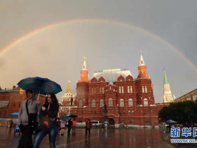 一道彩虹跨越俄罗斯首都莫斯科红场上空