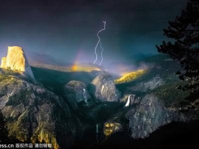 美国优胜美地国家公园闪电穿透彩虹