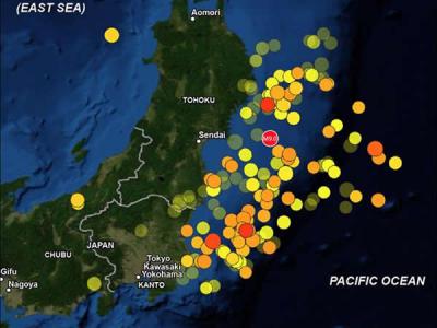 此地图显示了2011年3月11日日本东北地区发生的9.0级主震,以及震级为5.5的166次余...