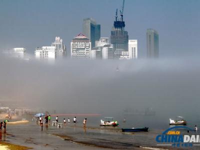 山东烟台市区海滨出现“海市蜃楼”般的平