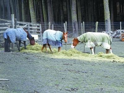 新西兰北岛汤加里罗国家公园,身着“衣物”的马匹在覆盖着火山灰的地面上吃草料。...