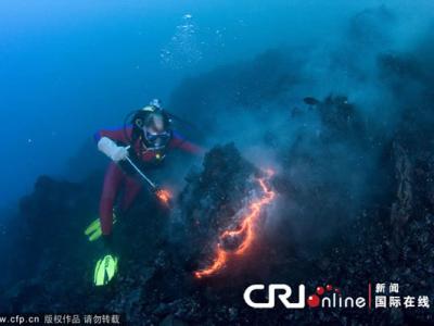 美国夏威夷海底潜水员用双手触碰1000摄氏度的熔岩 美国夏威夷海底潜水员用双手...