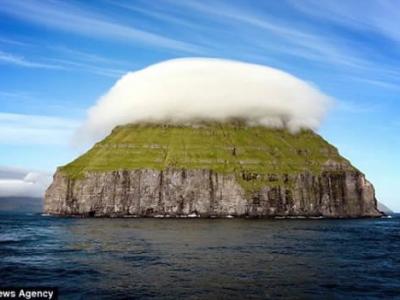 法罗群岛的偏远岛屿拉姆特拉-德姆岛,顶部被一个形状奇特的云朵罩住,好似一个巨...