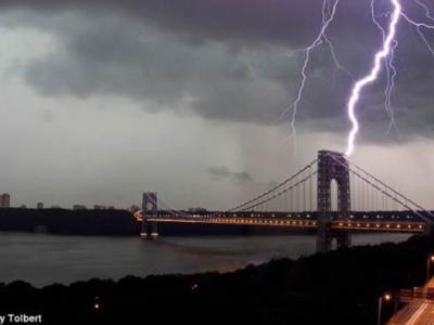 19日夜晚,一名摄影师在纽约捕捉到闪电击中乔治华盛顿大桥的惊人瞬间 纽约市遭...