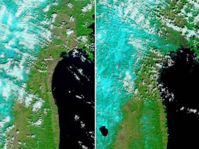 美国卫星拍摄日本仙台附近海啸前后对比图