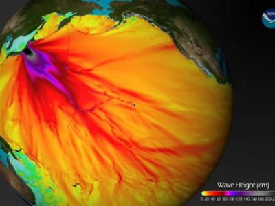 这是对日本8.9级地震引发海啸的示意图。这张图像中可以反映地震后24小时内海啸的...