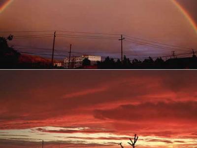 新疆富蕴同时出现彩虹和火烧云 6月2日傍晚,新疆富蕴县城东边出现一道彩虹,同时...