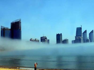 2010年6月6日,在青岛第三海水浴场附近出现彩色平流雾奇观。 CFP
