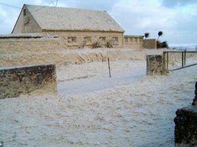 海浪泡沫像厚厚的白色毯子一样覆盖着康沃尔佩伦波斯的部分地段,看起来像白茫茫的...