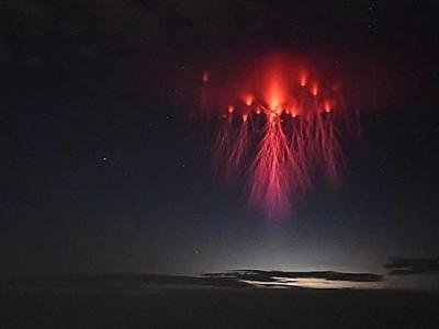 美国德州天文学家Stephen Hummel在洛克山山脊上捕捉到“红色精灵”自然现象(蜘蛛网...