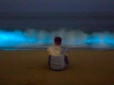 美国摄影师拍到加州纽波特港海滩出现藻类触发的生物发光现象—...