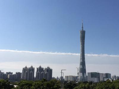 广州塔浸泡在一半白云和一半蓝天之中。网民拍摄的“阴阳天”奇...