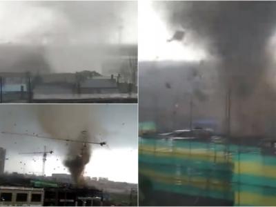 嫩江县城南市区上空出现一道灰白色、浑浊的龙卷风,...