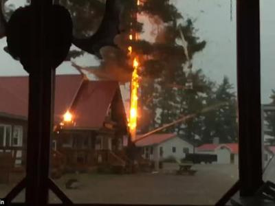 加拿大魁北克省大树被雷电击中形成强光,场面震撼视...