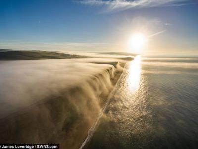 英国多塞特郡西湾出现奇特自然现象,一片白雾在崖边如瀑布向下飞泻 (蜘...