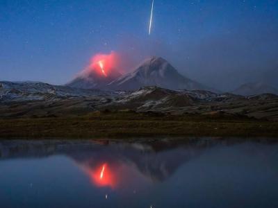 俄罗斯堪察加半岛的克柳切夫火山喷发巧遇流星划过天际 (蜘蛛网eeook.com报道)...
