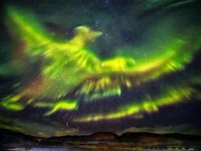 冰岛摄影师拍摄到北极光化身火凤凰黑夜展