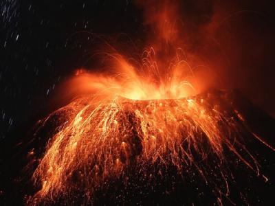 通古拉瓦火山喷出溶岩。 火山灰柱状云伸向高空。 火山喷灰烬的同时,附近城...