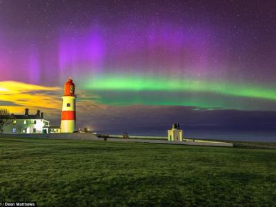 英国摄影师Dean Matthews在新特兰南希尔兹灯塔拍得炫目北极光“星空下的彩...