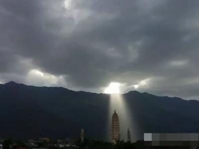 一道“佛光”穿破厚重的云海,直接照射在崇圣寺三塔。 网民形容该景象确有“佛...