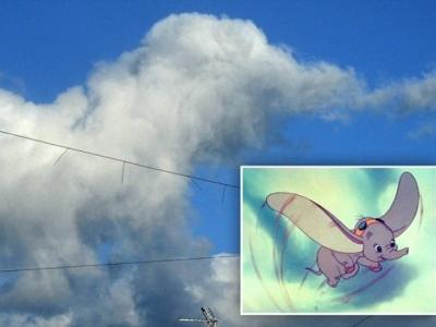 英国阿尼克镇上空的云团(大图)有如迪士尼卡通角色小飞象(小图)。 小飞象云...