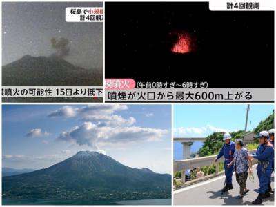 樱岛火山周日凌晨多次爆发(左上、右上图),当局派员协助居民疏散(右下图)。 ...