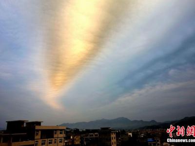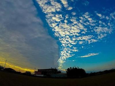 台湾新竹县湖口乡上空18日下午出现“阴阳云”景观,在冬日夕阳的衬托下,显得格外...