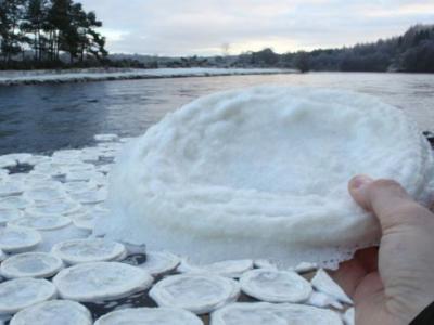 苏格兰河流现奇景 水面满布圆圆“冰饼” 专家指泡沫爆破后,在气温急降情况下...