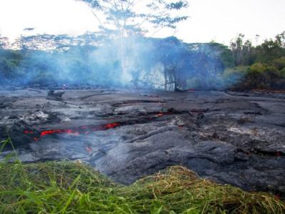 熔岩流迫近帕霍亚镇 熔岩流前沿有植物着火冒烟 地质学家前往研究熔岩流流向...