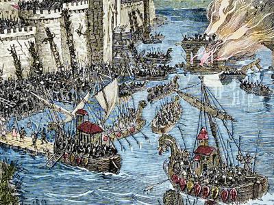 一幅19世纪的彩色版画,描绘了885-886年维京人对巴黎的袭击。(图片来源:clu via ...
