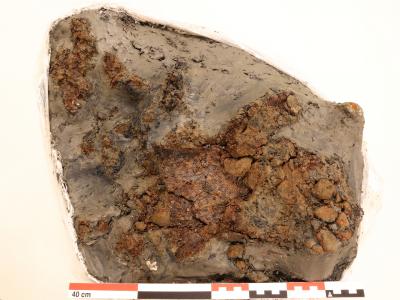 从考古遗址移走后,在奥斯陆Bispekiva南部发现的中世纪铁手套遗迹。(图片来源:挪...